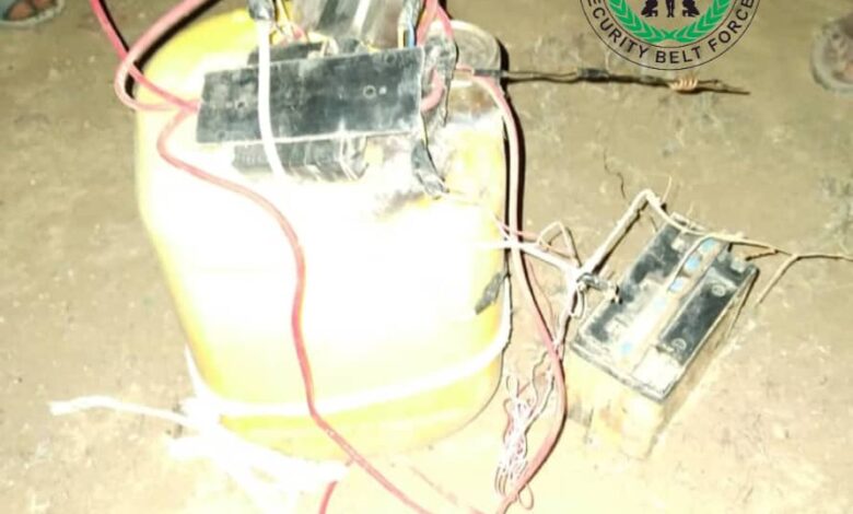 وذكر مصدر عملياتي ان فرق قوات الحزام الأمني الهندسية فككت عبوة ناسفة كانت مزروعة على جنبات الخط الرئيسي، بمنطقة امخديرة، بعد ان عثرت قواتنا عليها، وزرعت بهدف استهداف آليات القوات المسلحة الجنوبية التي تمر هناك.