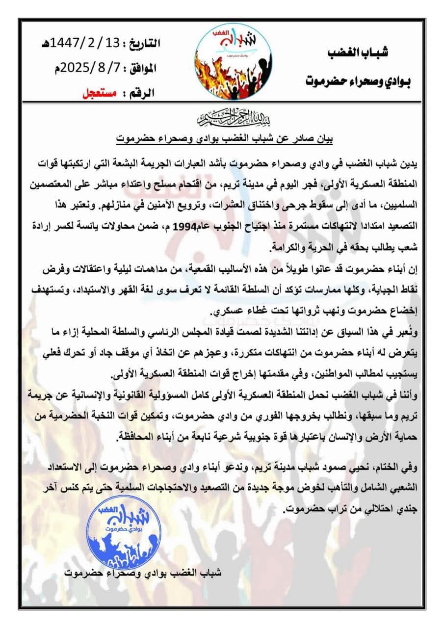 وأننا في شباب الغضب نحمل المنطقة العسكرية الأولى كامل المسؤولية القانونية والإنسانية عن جريمة تريم وما سبقها، ونطالب بخروجها الفوري من وادي حضرموت، وتمكين قوات النخبة الحضرمية من حماية الأرض والإنسان باعتبارها قوة جنوبية شرعية نابعة من أبناء المحافظة.