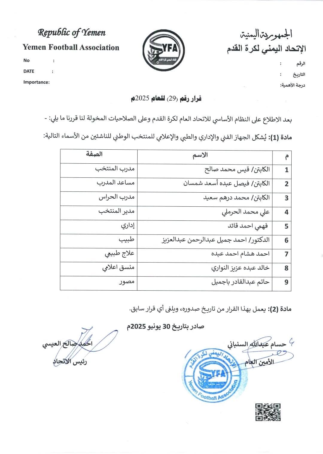 صدر قرار الاتحاد اليمني لكرة القدم رقم (29) للعام 2025م والذي نص على تشكيل الجهاز الفني والإداري والطبي والإعلامي للمنتخب الوطني للناشئين من الأسماء التالية: