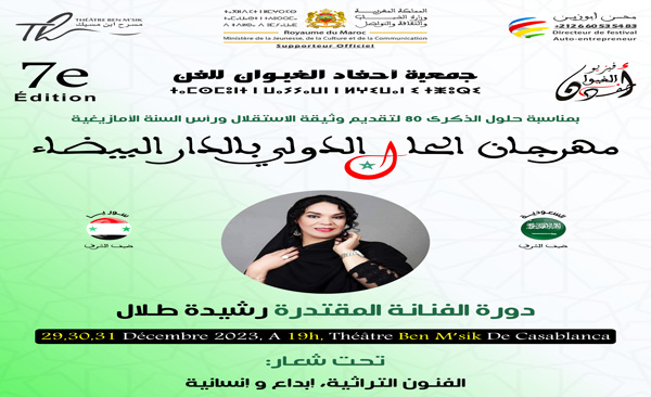 المهرجان، الذي ينظم بدعم من وزارة الشباب والثقافة والتواصل، اختار منظموه شعار “الفنون التراثية.. إبداع وإنسانية”، كما اختاروا تكريم الفنانة والمطربة رشيدة طلال، التي تحمل الدورة اسمها.