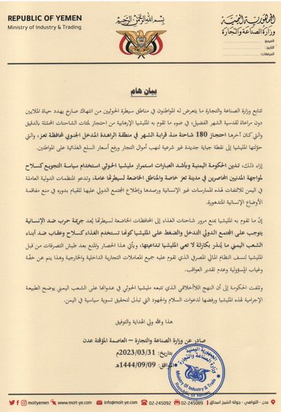 أصدرت وزارة الصناعة والتجارة في العاصمة المؤقتة عدن بيانا هاما ادانت فيه بأشد العبارات كل ما يتعرض له المواطنون في مناطق سيطرة الحوثيين من سياسة التجويع والتي تعد إنتهاك صارخ يهدد حياة الملايين دون مراعاة لقدسية الشهر الفضيل .