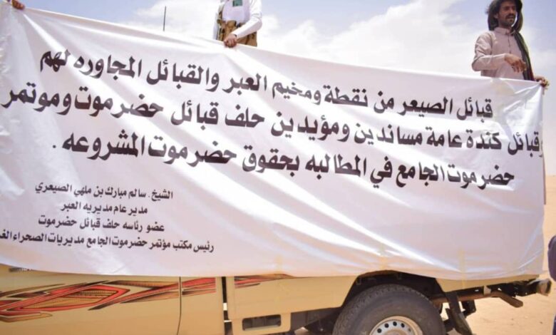 بدورهم، أكد المجتمعون من قبائل الصيعر وكنده ونهد والكرب والبريك تاييدهم ومساندتهم الكامله لمطالب أبناء حضرموت التي نادى بها حلف قبائل حضرموت ومؤتمر حضرموت الجامع في قراراتهم المتخذه بخصوص المطالبة بحقوق حضرموت المشروعة والمحقة لابناء حضرموت عامة، مشيدين بالمواقف المشرفه للمدير العام لمديرية العبر الشيخ سالم بن ملهي الصيعري لخدمة المديرية والمواطنين فيها وكذا النازحين وتقديم كافة الدعم والتسهيلات اللازمة لضمان العيش الكريم رغماً عن عدم تدخل السلطات الحكومية في تلبية مطالب أبناء المديرية من إصلاح الطريق الدولي الرابط بين بن عيفان ومديرية العبر وكذا عدم ربط المديرية بالكهرباء إلى جانب عدم قيامها بإصلاحات جذرية لمعالجة الوضع الراهن وغلاء المحروقات والمعيشة .