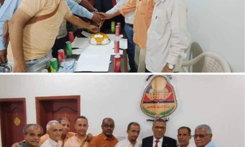 عمال مؤسسة المطابع الكتاب المدرسي يهنئون مديرهم السابق/ محمد باسليم بتعيينه مديرا للمكتب الفني وافتتاح المكتب بإنماء….