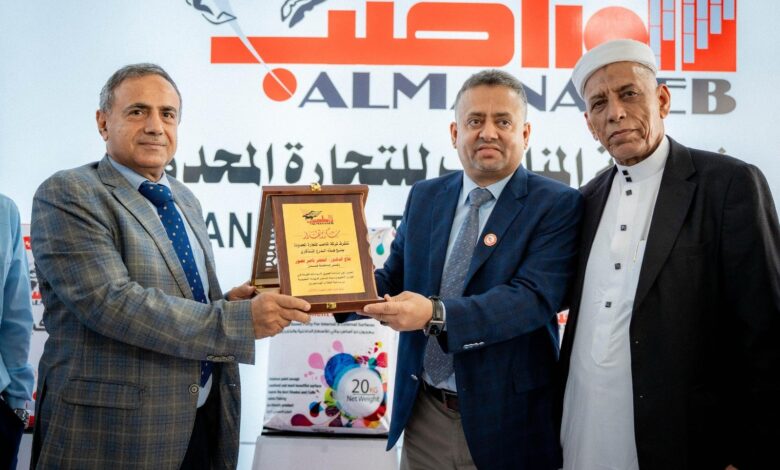 كرم مدير عام شركة المناصب للتجارة “المحدودة” الاستاذ أحمد المنصب، وبحضور الشيخ محمد المنصب، رئيس جامعة عدن، الدكتور الخضر ناصر لصور، بدرع الشركة، وذلك خلال زيارته لجناح الشركة في معرض البناء المقام في عدن.