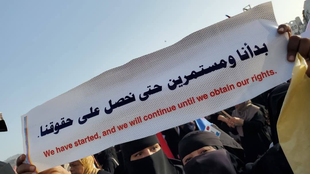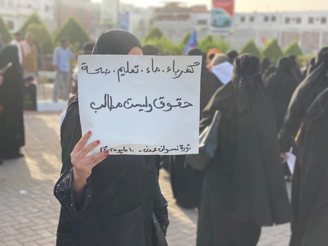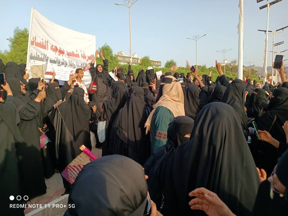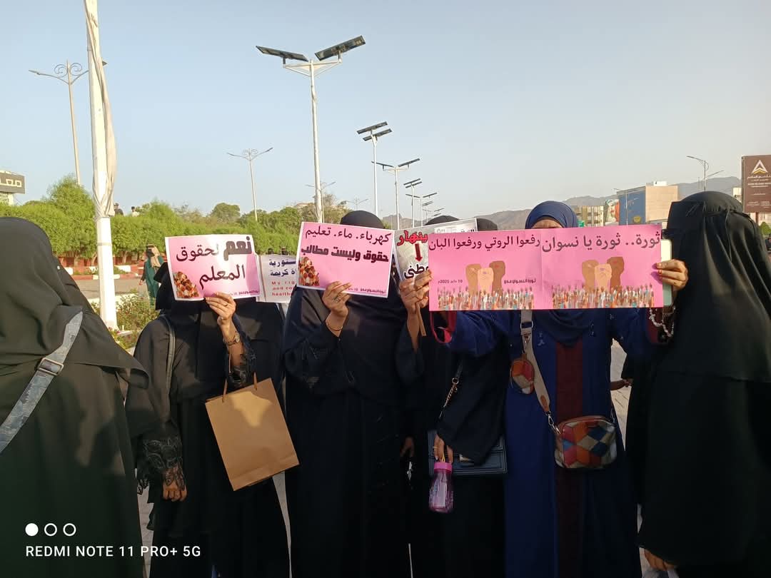 توافدت النساء من مختلف مديريات المدينة ورفعن لافتات تطالب بتوفير التيار الكهربائي والمياه، وصرف الرواتب المتأخرة، وتحسين قيمة الريال اليمني الذي اقترب من حاجز 2600 ريال مقابل الدولار الأميركي لأول مرة في التاريخ.