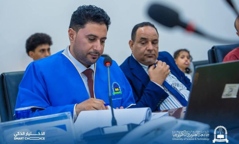 جرت المناقشة العلنية للرسالة يوم الأربعاء الموافق 21 مايو 2025م، في قاعة السمنار بمبنى جامعة العلوم والتكنولوجيا في عدن، بحضور مساعد رئيس الجامعة لشؤون الفروع ومراكز التنمية المجتمعية د. منير العبادي، وعدد من الأكاديميين والباحثين والمهتمين، بالإضافة إلى زملاء وأقارب الباحث.