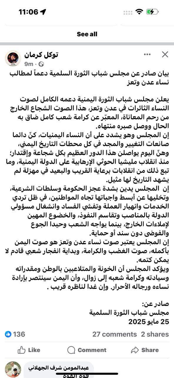 نحن، نساء الثورة في عدن، نؤكد وبشكل قاطع أن لا علاقة لنا بتوكل كرمان، لا من قريب ولا من بعيد، ولم نخولها أو نسمح لها بالتحدث باسمنا أو إصدار أي بيانات تمثلنا. إننا نرفض محاولات توظيف نضال نساء عدن واستخدامه في أجندات سياسية لا تمثلنا ولا تعبّر عن تطلعاتنا.