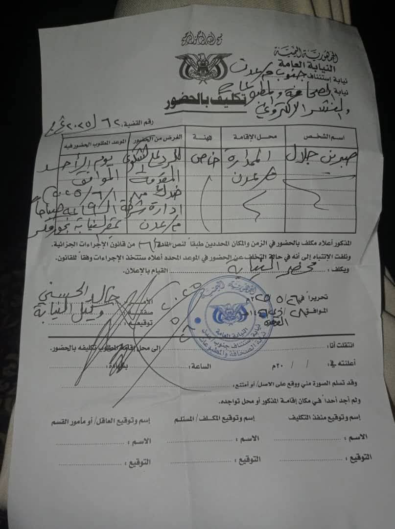 وجهت نيابة الصحافة والمطبوعات والنشر الإلكتروني أمر حضور للناشطة صبرين جلال للمول أمامها يوم الأحد القادم الساعة التاسعة صباحا في مقر النيابة بخور مكسر وذلك للرد على الشكوى المقدمة ضدها من إدارة شرطة م_عدن..