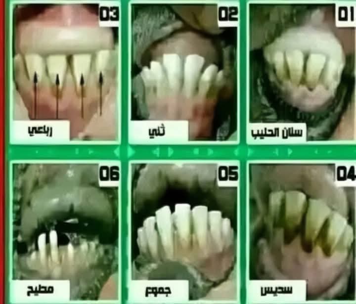 05 ) بعد مرور ثلاث سنوات من العمر يبدأ الحيوان بتبديل السنين ما بعد الرباعيات ، وهنا يكون قد استبدل 06 أسنان، فيقال له : ” سداس ” .