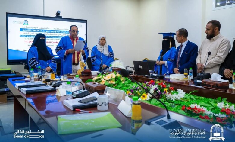 منحت عمادة الدراسات العليا والبحث العلمي بجامعة العلوم والتكنولوجيا – المركز الرئيس عدن درجة الماجستير بتقدير امتياز للباحثة/ نيڤين بديع عبد الصفي سعيد عن رسالتها الموسومة بـ: “أثر ممارسات الإدارة الاستراتيجية في بناء المنظمة الذكية (دراسة ميدانية على شركات الاتصالات الخلوية العاملة في اليمن)”.