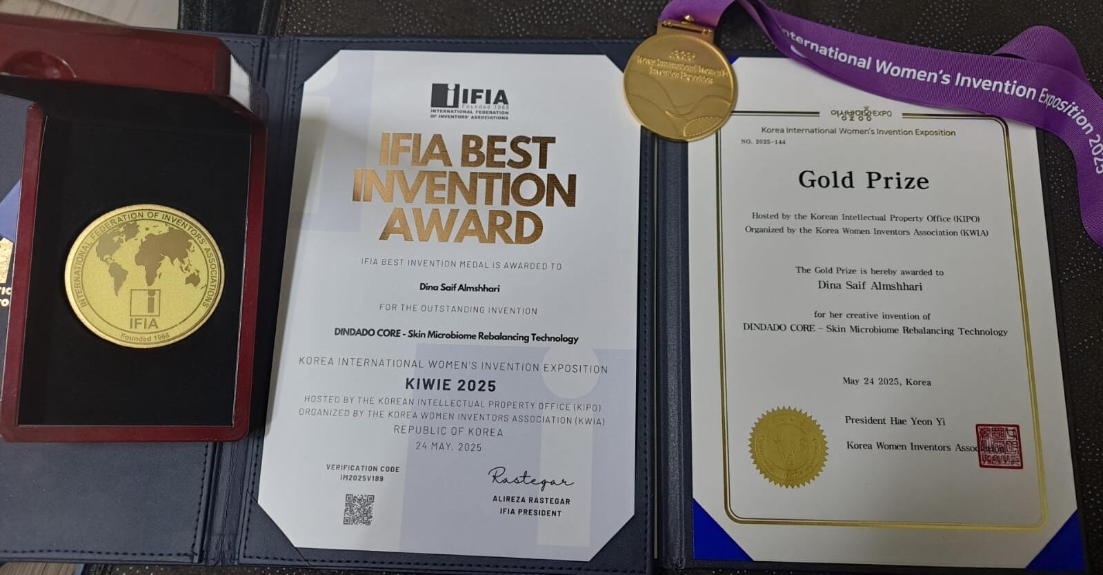 في عرض علمي فريد احتضنه مركز KINTEX الدولي في العاصمة الكورية سيول، نجحت العالمة الكيميائية والمخترعة د.دينا سيف المشهري في تقديم مشروعها الرائد DINDADO Core، والذي حصد ثلاث جوائز دولية مرموقة، بينها الميدالية الذهبية الكورية، ووسام الاتحاد الدولي للمخترعين (IFIA)، وجائزة شرفية من مركز النساء المخترعات في أوزبكستان، ليؤكد مكانته كمشروع علمي تجميلي متكامل يجمع بين الابتكار والجاهزية التجارية العالمية.