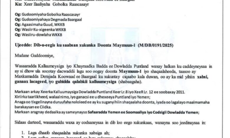 أصدر مكتب وزارة الخارجية بحضرموت مساء اليوم (وثيقة) صادرة عن حكومة ولاية بونتلاند الصومالية وزارة الثروة السمكية والموارد البحرية مكتب الوزير موجهة إلى: رئيس المحكمة الاستئناف – بَرْغَل، وقاضي منطقة رأس عسير وحاكم منطقة رأس عسير، ومحافظ مديرية برغال ، والمدير العام للوزارة ، ونائب الوزير ووزير الدولة في الوزارة بشأن مراجعة بشأن الحكم الصادر على السفينة “ميمون-1” (المرجع: M/DB/0191/2025)