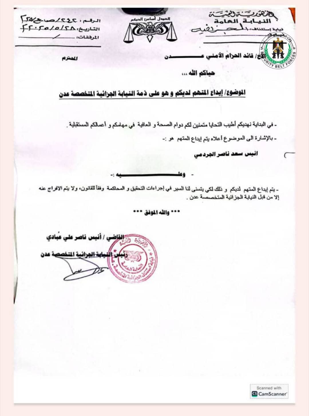 ـ إن عملية توقيف المتهم أنيس الجردمي تمت وفقًا للإجراءات القانونية، وبناءً على أمر قبض قهري صادر عن نيابة الأمن والبحث – عدن، بتاريخ 1 أبريل 2025، على خلفية اتهامات تتعلق بالإساءة والتحريض.