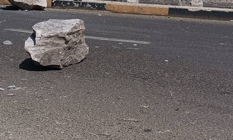 بالصور…سقوط احجار كبيرة من جبل شمسان إلى طريق العقبة