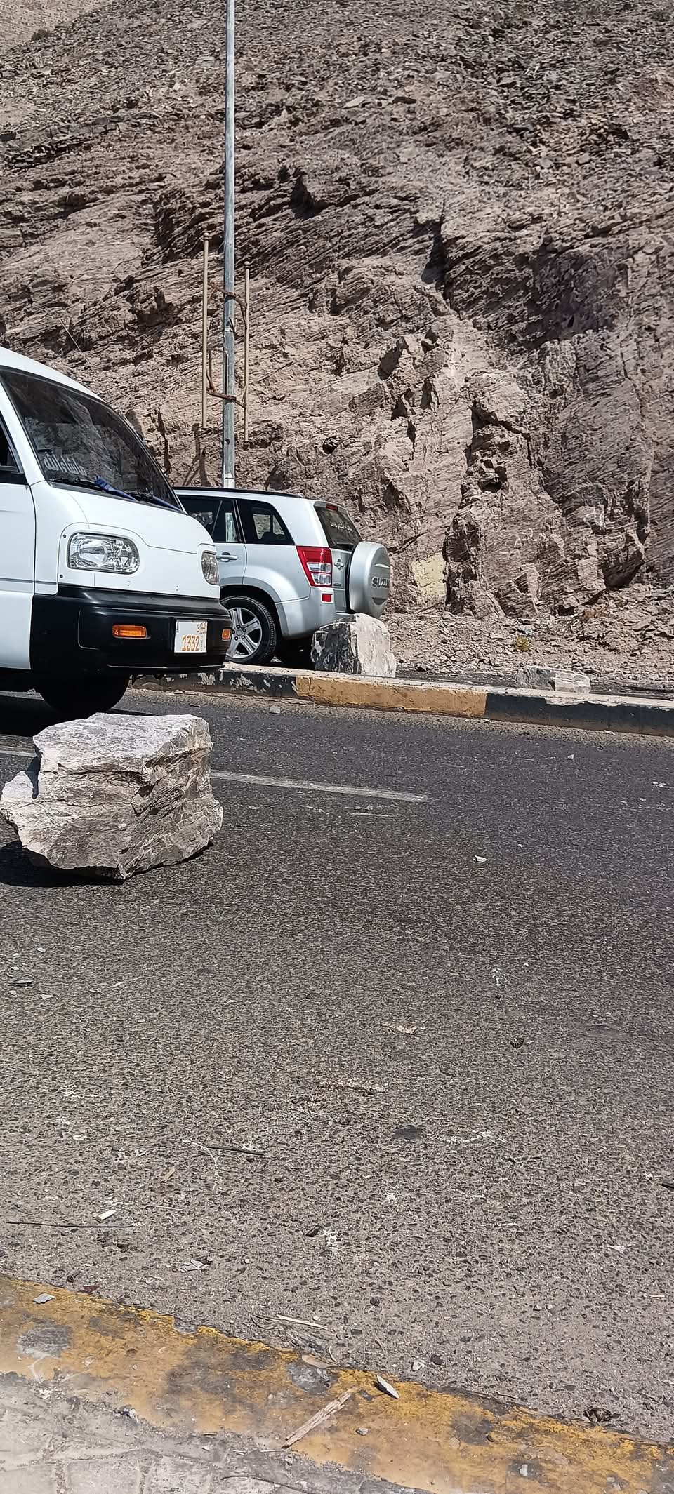 سقطت بعد ظهر اليوم الاحد احجار بحجم كبير من جبل شمسان على الخط المؤدي إلى كريتر المعلا في عقبة عدن بالقرب من النقطة..