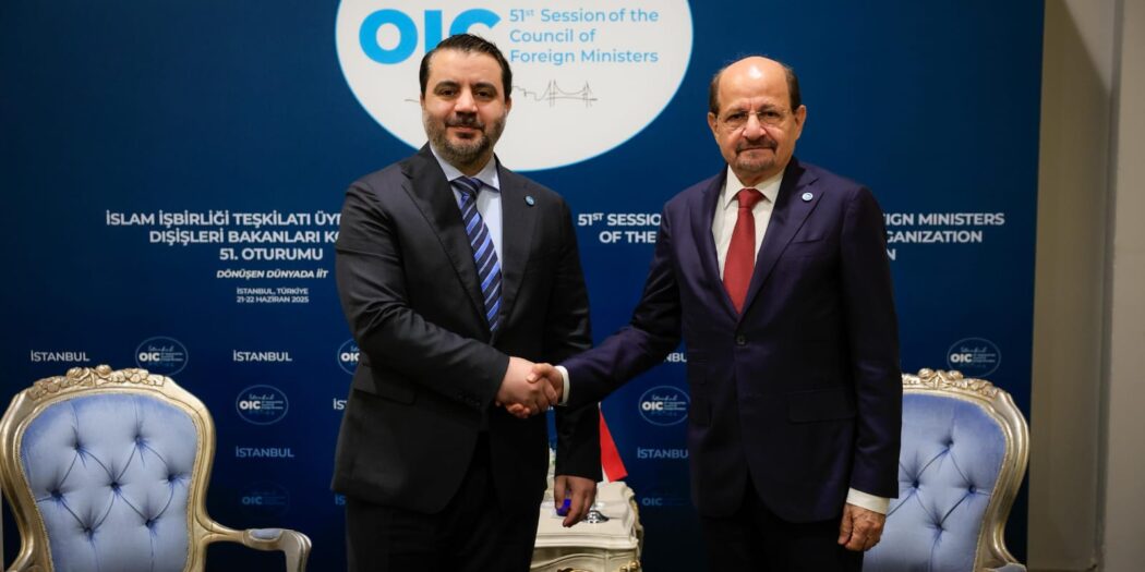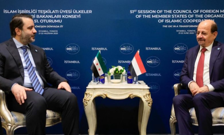 التقى معالي الدكتور شائع محسن الزنداني، وزير الخارجية وشؤون المغتربين، اليوم، بمعالي الدكتور أسعد الشيباني، وزير الخارجية والمغتربين في الجمهورية العربية السورية، وذلك على هامش اجتماعات منظمة التعاون الإسلامي المنعقدة في مدينة إسطنبول بالجمهورية التركية.