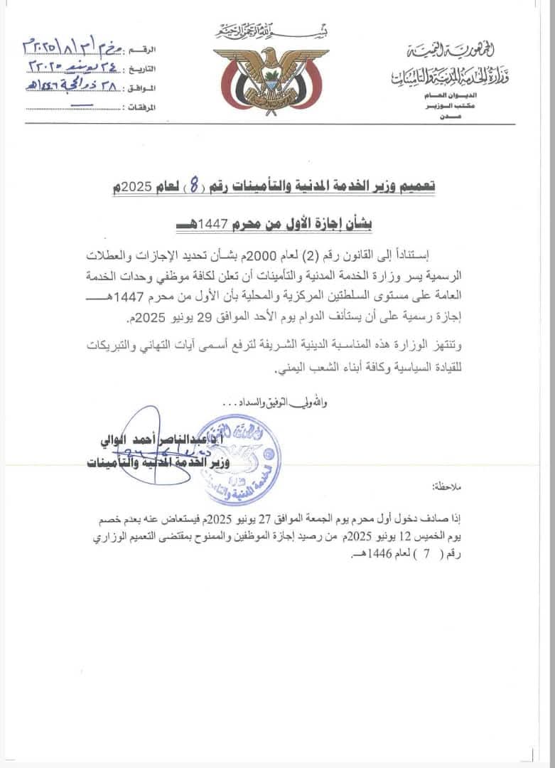 تعميم وزير الخدمة المدنية والتأمينات رقم (8)لعام 2025م بشأن إجازة الاول من محرم 1447ه