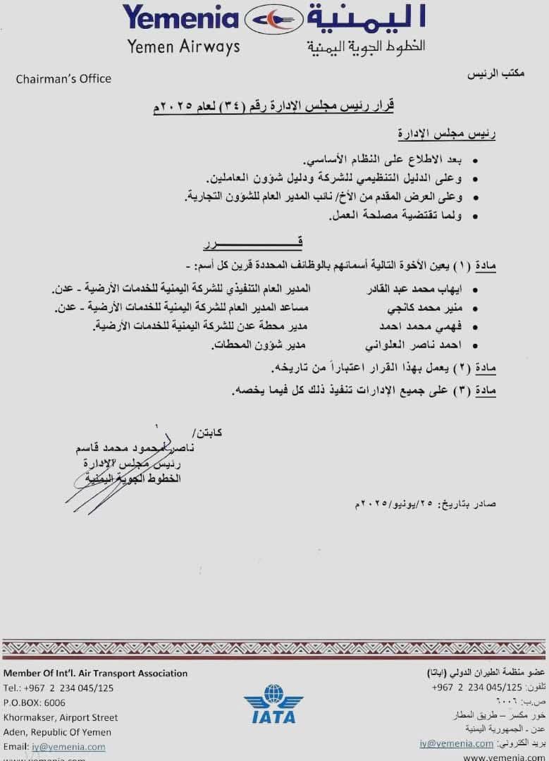 بناءً على توجيهات معالي وزير النقل الدكتور عبدالسلام صالح حُميد، أصدر رئيس مجلس إدارة شركة الخطوط الجوية اليمنية الكابتن ناصر محمود محمد قاسم، قراراً رقم (34) لعام 2025، بتعيين كلا من إيهاب محمد عبد القادر – مديراً عاماً تنفيذياً للشركة اليمنية للخدمات الأرضية – عدن، ومنير محمد كانجي – مساعداً للمدير العام للشركة اليمنية للخدمات الأرضية – عدن، وفهمي محمد أحمد – مديراً لمحطة عدن للشركة اليمنية للخدمات الأرضية، وأحمد ناصر العلواني – مديراً لشؤون المحطات، خلفاً للطاقم الإداري السابق.
