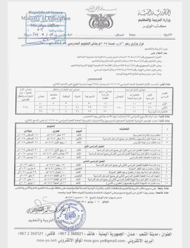 حيث صدر اليوم الأحد القرار الوزاري رقم ٥٣ لعام ٢٠٢٥م بشأن التقويم المدرسي للعام ٢٠٢٦/٢٠٢٥م، والذي أشار إلى موعد انتظام الإدارات المدرسية سيكون يوم الاحد ١٧ أغسطس المقبل، على أن تبدأ عملية القيد والتسجيل والانتقال في جميع المراحل الدراسية يوم الاثنين في الثامن عشر من الشهر ذاته، وانتظام دوام هيئة التدريس في ٢٤ أغسطس، على أن يكون انطلاق الدراسة الفعلية للفصل الدراسي الأول يوم الأحد ٣١ أغسطس ٢٠٢٥م.