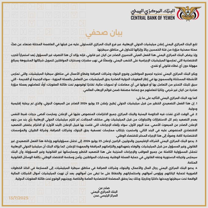 وإذ يرفض البنك المركزي اليمني هذا الفعل العبثي التدميري الصادر عن كيان غير قانوني، فإنه يؤكد أن هذا التصرف غير المسؤول يُعد استمراراً للحرب الاقتصادية التي تمارسها الميليشيات الإجرامية على الشعب اليمني، وإمعانًا في نهب مقدرات ومدخرات المواطنين لتمويل شبكاتها المشبوهة بمبالغ مهولة دون أي غطاء قانوني أو نقدي.