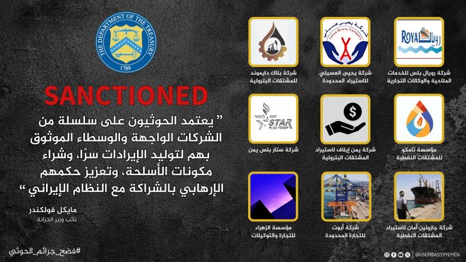 ونشرت السفارة تصميماً تضمن أسماء تسع شركات يمنية فُرضت عليها عقوبات أمريكية لارتباطها بتقديم تسهيلات مالية وتجارية لجماعة الحوثي، وهي: شركة بلاك دايموند للمشتقات البترولية، شركة يحيى العسيلي للاستيراد المحدودة، شركة رويال بلس للخدمات الملاحية والوكالات التجارية، شركة ستار بلس يمن، شركة يمن إيلاف لاستيراد المشتقات البترولية، مؤسسة تامكو للمشتقات النفطية، مؤسسة الزهراء للتجارة والتوكيلات، شركة أبوت للتجارة المحدودة، وشركة جازولين أمان لاستيراد المشتقات النفطية.