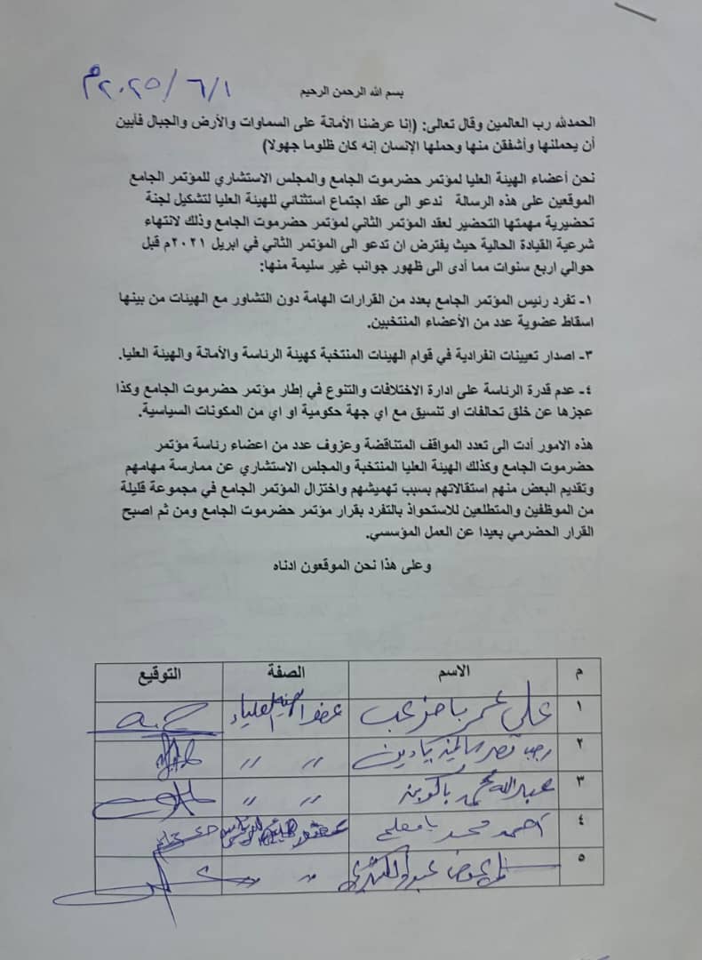 وأصدروا بهذا الدعوة بيانًا أوضحوا فيه أن السبب هو انتهاء شرعية القيادة الحالية حيث كان من المفترض أن تدعو القيادة إلى المؤتمر العام في أبريل 2021م أي قبل حوالي أربع سنوات . وأشاروا في بيانهم إلى أن هذا التأخير أدى إلى جوانب غير سليمة . وأضافوا أن هذه الأمور أدت إلى تعدد المواقف المتناقضة وعزوف أعضاء عن ممارسة مهامهم . ونتيجة لذلك أصبح القرار الحضرمي بعيدًا عن العمل المؤسسي .