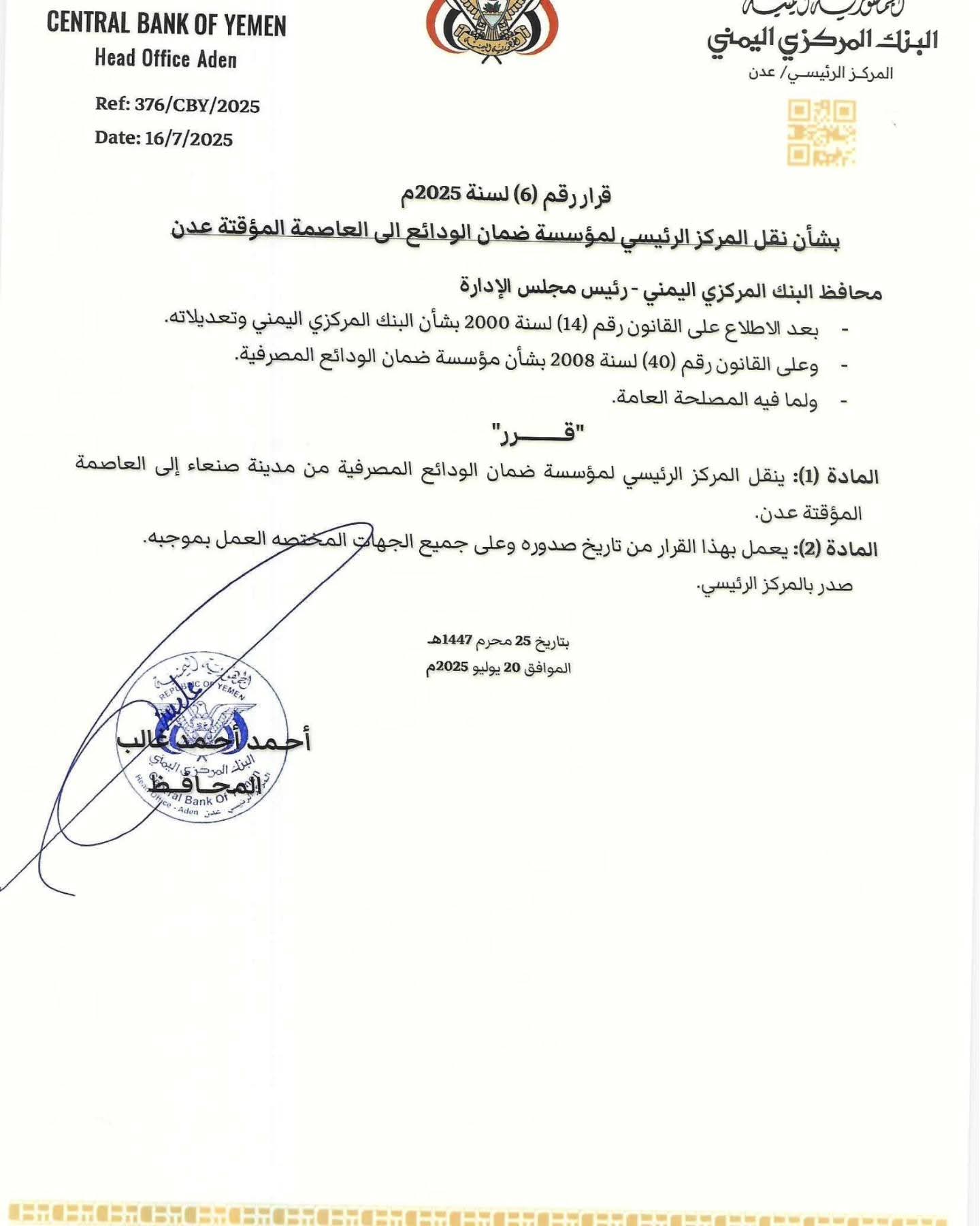 أصدر محافظ البنك المركزي أ. أحمد أحمد غالب قرار رقم (6) لعام 2025م، بشأن نقل المركز الرئيسي لمؤسسة ضمان الودائع الى العاصمة المؤقتة عدن.