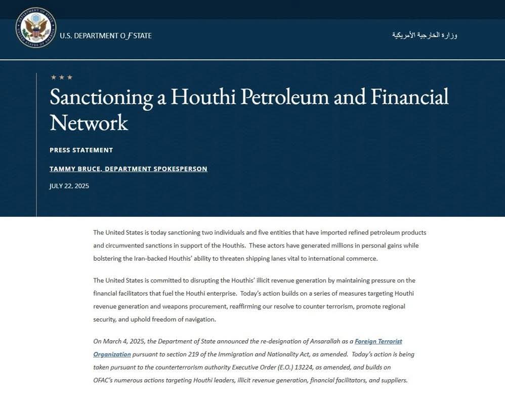 وأوضحت وزارة الخزانة الأميركية، في بيان اليوم، أن العقوبات شملت فردين وخمسة كيانات تُعد من بين أبرز مستوردي المنتجات النفطية وغاسلي الأموال الذين يقدمون دعماً مباشراً للحوثيين، وفق وكالة رويترز.