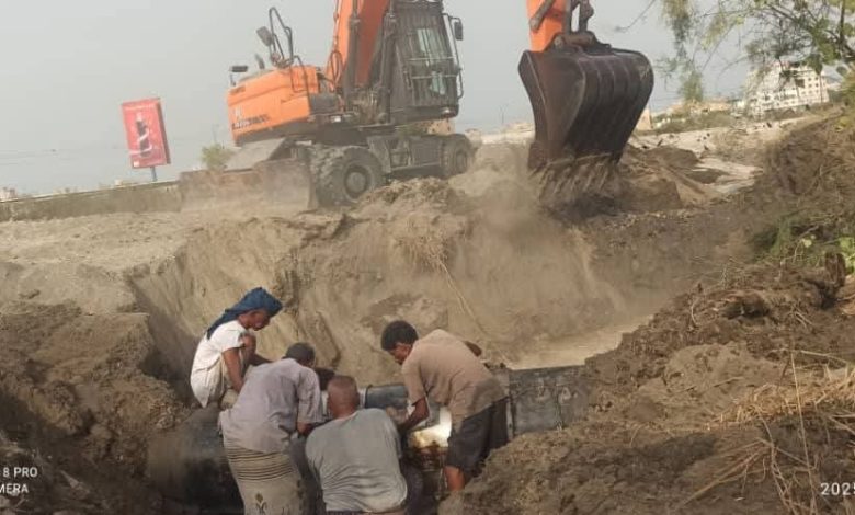 فرق مؤسسة المياه بعدن تنهي إصلاح كسر في خط المياه الرئيسي القادم من حق بئر ناصر