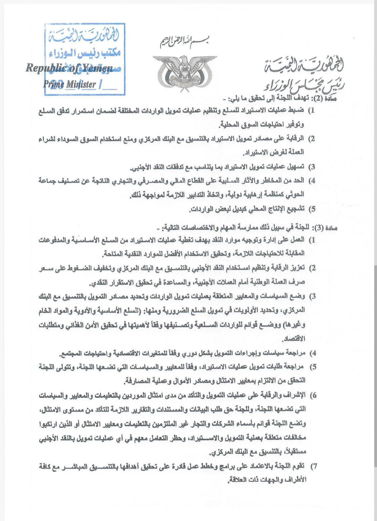 مادة (1): أ. تشكل لجنة بموجب هذا القرار تسمى اللجنة الوطنية لتنظيم وتمويل الواردات، برئاسة الأخ/ محافظ البنك المركزي اليمني، وعضوية كلاً من :