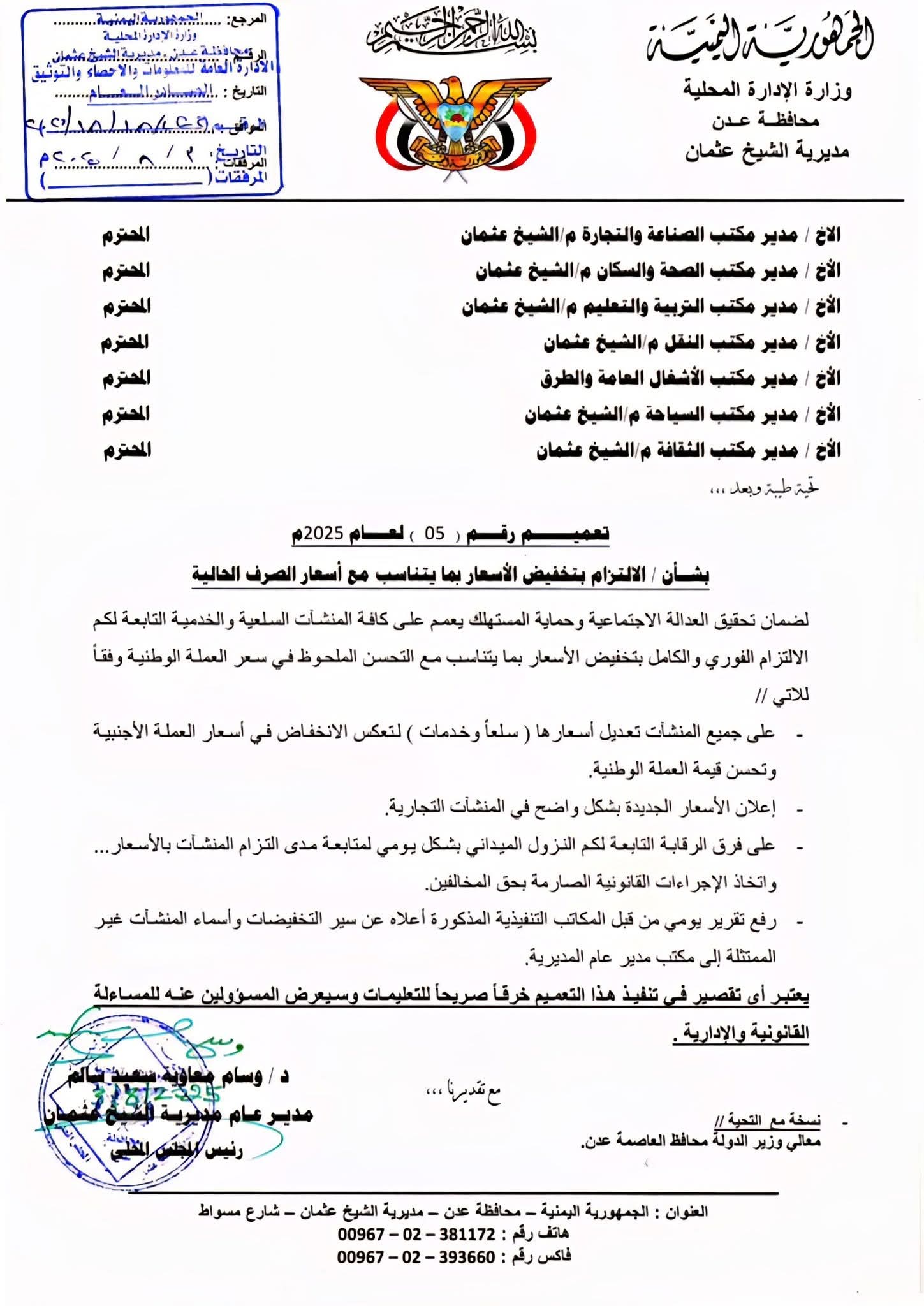 مدير عام مديرية الشيخ عثمان يصدر تعميمًا بشأن التزام المنشآت بتخفيض الأسعار بما يتناسب مع أسعار الصرف الحالية