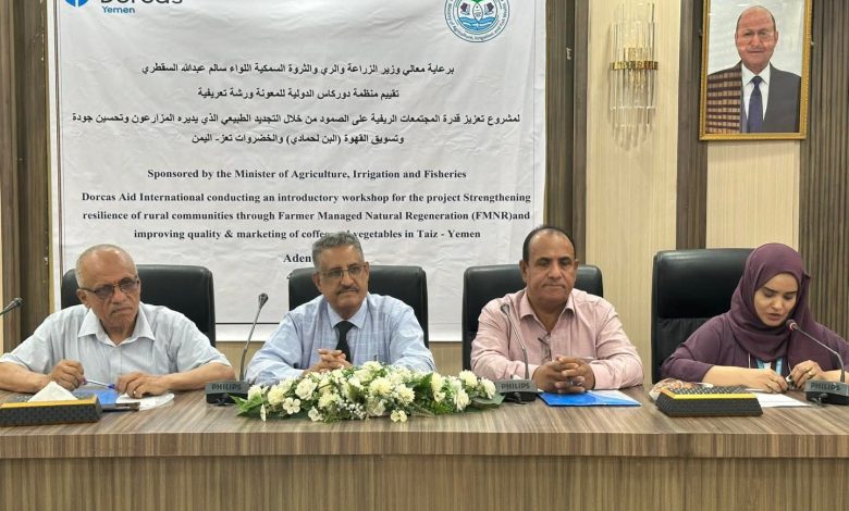 برعاية وزير الزراعة والري والثروة السمكية اللواء سالم السقطري أقامت منظمة دروكاس الدولية للمعونة ورشة تعريفية بمشروع تعزيز قدرة المجتمعات الريفية على الصمود من خلال التجديد الطبيعي الذي يديره المزارعون وتحسين جودة وتسويق القهوة (البن الحمادي) والخضروات الذي ستنفذه المنظمة بمحافظة تعز .بتكلفة مليون ومئتان الف يورو.
