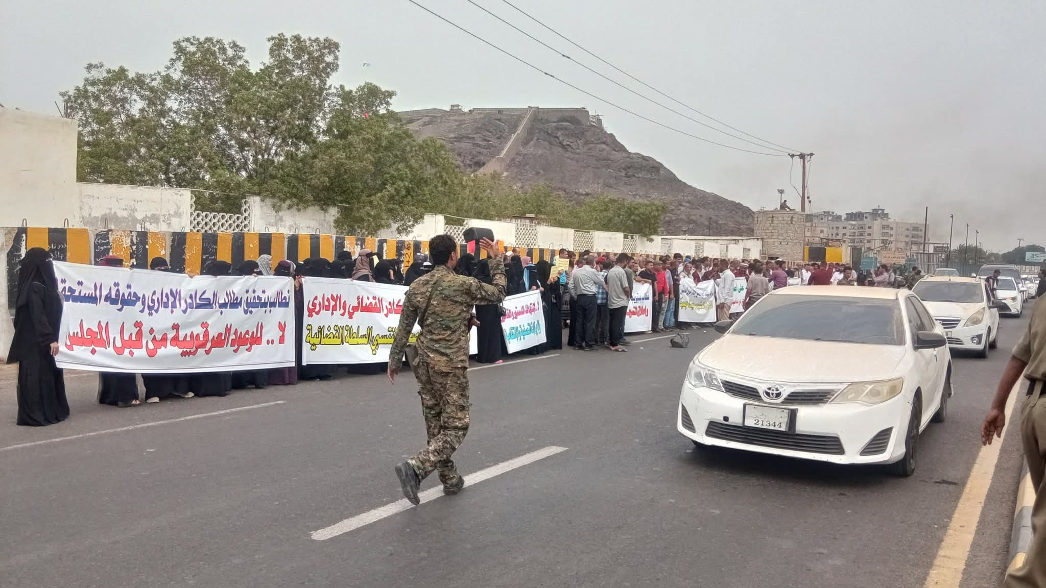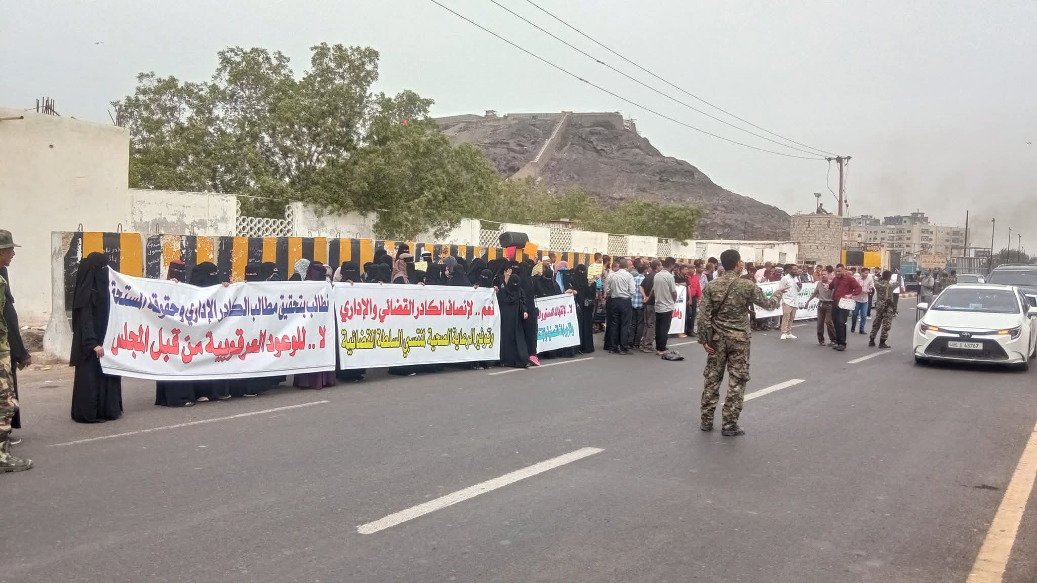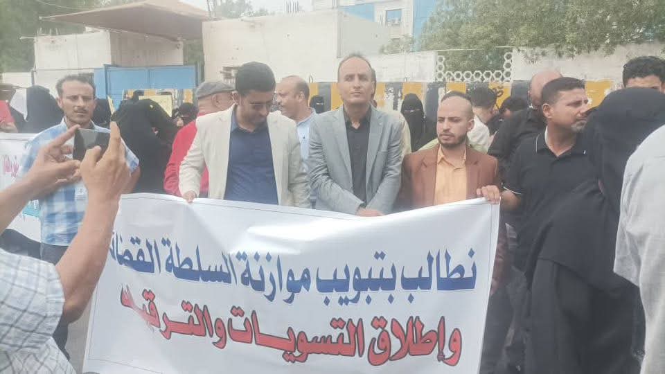 وقفة احتجاجية أمام مجلس القضاء الأعلى بالعاصمة عدن تنديداً لعدم استجابة المجلس لمطالب منتسبي السلطة القضائية