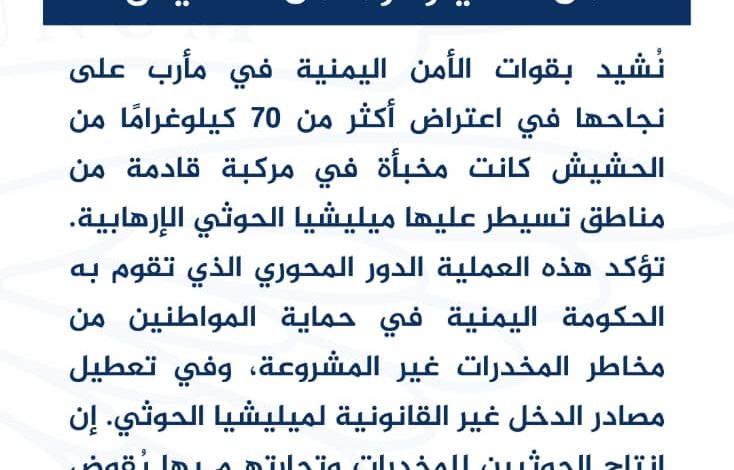 وقالت السفارة الأمريكية لدى اليمن، في بيان نشرته على حسابها في منصة “إكس”، الأربعاء:“ نشيد بنجاح قوات الأمن اليمنية في مأرب في اعتراض أكثر من 70 كيلوغرامًا من الحشيش كانت مخبأة داخل مركبة قادمة من مناطق تسيطر عليها جماعة الحوثيين الإرهابية.”