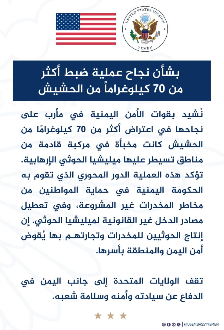 أشادت الولايات المتحدة الأمريكية بنجاح السلطات الأمنية التابعة للحكومة اليمنية المعترف بها دوليًا، في ضبط شحنة مخدرات قادمة من مناطق سيطرة جماعة الحوثيين شمالي البلاد.