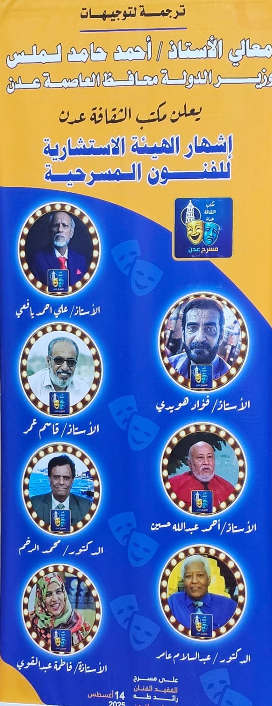 وتحاول مسيرة المسرح في عدن ان تستعيد وهج ابو الفنون وبريقة بعد ان خفت كثيرا من خلال إشهار ( الهيئة الاستشارية للفنون المسرحية ) من قبل مكتب ثقافة عدن وبرعاية وزير الدولة محافظ عدن الاخ الأستاذ أحمد حامد لملس .