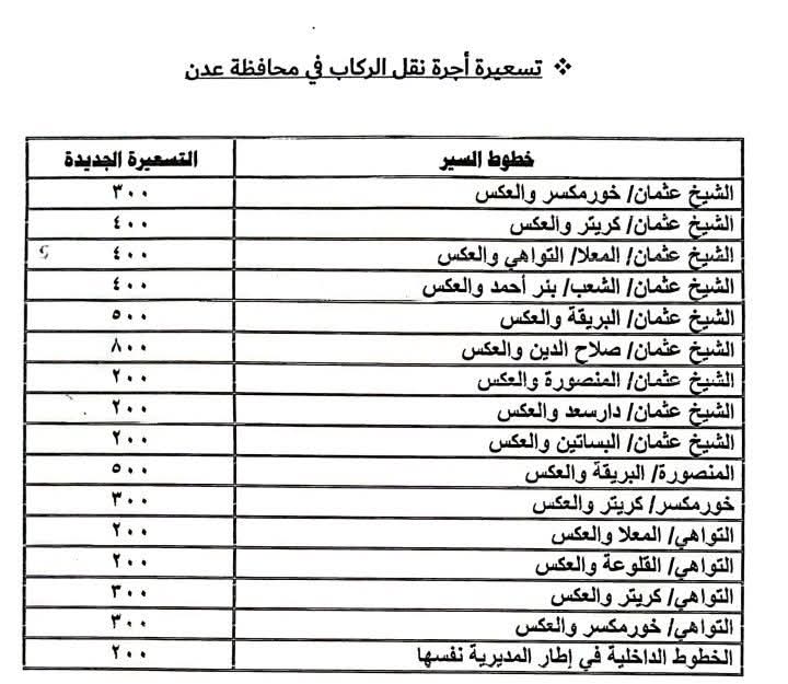 اقرار تعرفة جديدة لأجرة نقل الركاب في العاصمة عدن .