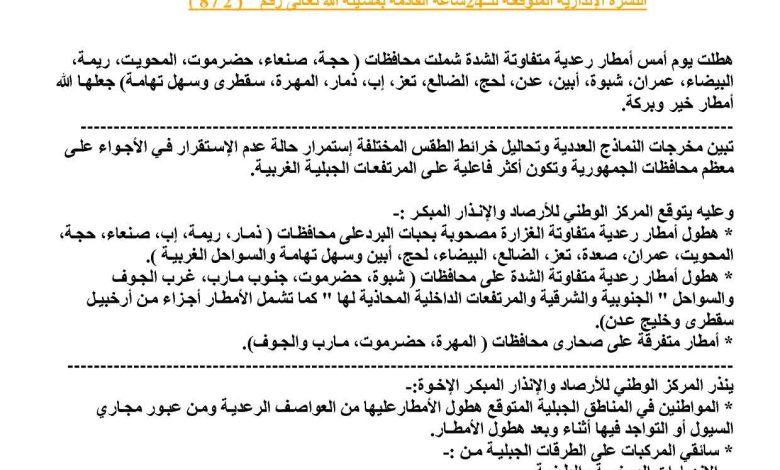 تبين مخرجات النماذج العددية وتحاليل خرائط الطقس المختلفة إستمرار حالة عدم الإستقرار في الأجواء على معظم محافظات الجمهورية وتكون أكثر فاعلية على المرتفعات الجبلية الغربية.