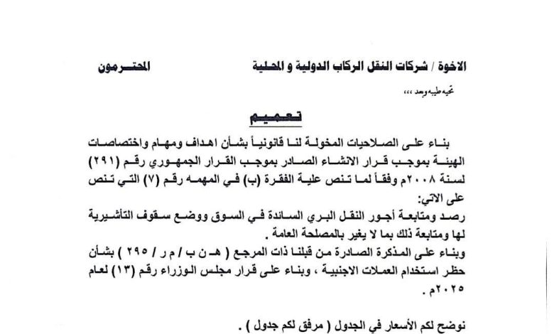 ويشمل التعميم، الموجه إلى شركات النقل البري الدولية والمحلية، توضيحًا لأسعار الخدمات في جدول مرفق، وذلك في سياق حرص الهيئة على تحقيق استقرار السوق ومتابعة التغييرات التي قد تؤثر على المصلحة العامة.