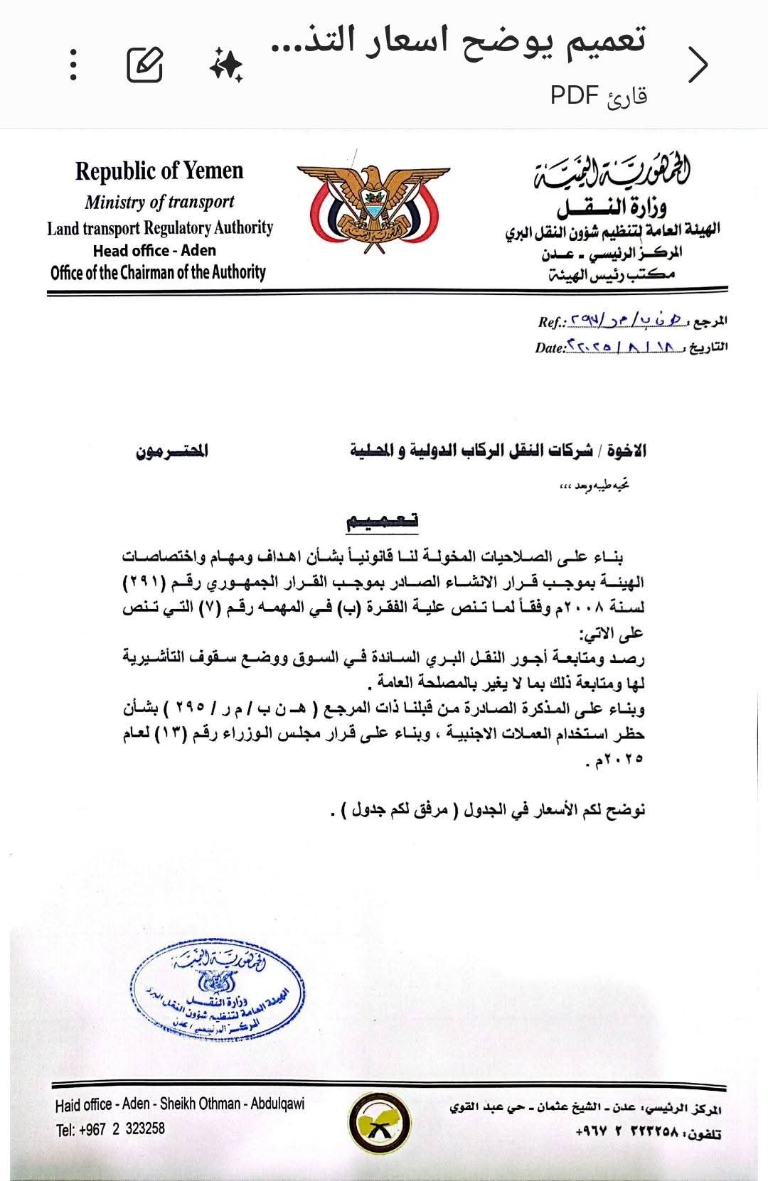 أصدرت الهيئة العامة لتنظيم شؤون النقل البري في العاصمة المؤقتة عدن، تعميمًا إداريًا يهدف إلى توضيح أسعار خدمات النقل يأتي هذا التعميم، الذي صدر بموجب قرار الإنشاء الصادر بالقرار الجمهوري رقم (291) لسنة 2008، وتأكيدًا للمادة (ب) في المهمة رقم (7) من نفس القرار، التي تنص على رصد ومتابعة أجور النقل البري.