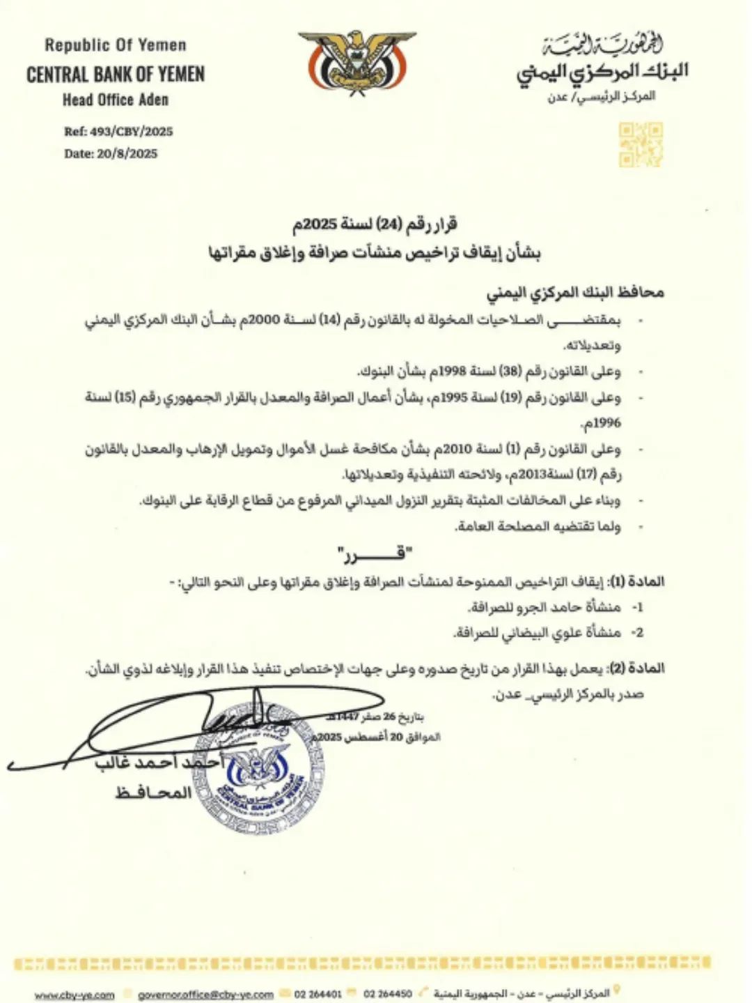 أصدر محافظ البنك المركزي أ. أحمد أحمد غالب قرار رقم (24) لعام 2025م، بشأن ايقاف التراخيص الممنوحة لعددٍ من منشآت الصرافة المخالفة وإغلاق مقراتها، والمثبتة بتقرير النزول الميداني المرفوع من قطاع الرقابة على البنوك.