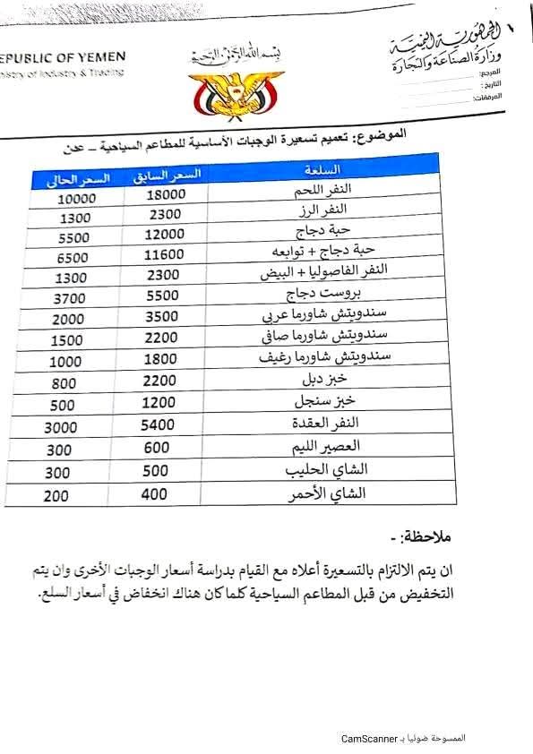 أصدر مكتب وزارة الصناعة والتجارة في العاصمة عدن، اليوم، تعميماً رسمياً موجهاً إلى مدراء مكاتب الصناعة والتجارة في المديريات، بشأن تسعيرة الوجبات الأساسية في المطاعم السياحية.