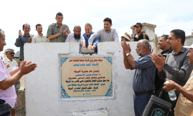 قام مدير عام البريقة في العاصمة عدن الدكتور صلاح الشوبجي، بمعية المدير التنفيذي لشركة مصافي عدن المهندس أحمد مسعد سعيد، بوضع حجر الأساس لمشروع بناء السوق المركزي للخضار واللحوم والأسماك في البي كلاس، بتمويل كلي من المجلس المحلي بالمديرية، وبتكلفة إجمالية بلغت “267” مليون و”034″ ألفًا و”401″ ريالًا.