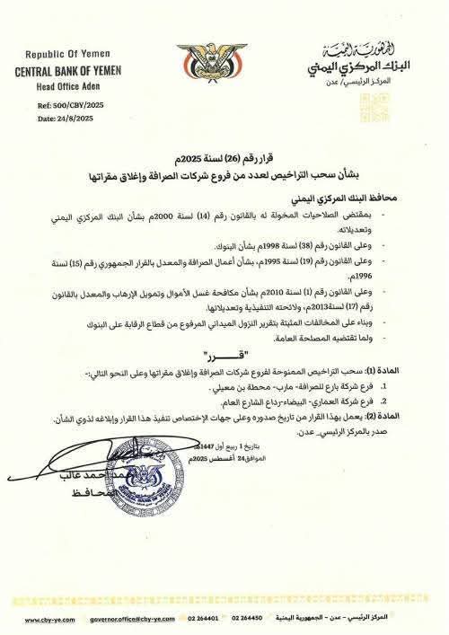 عدن اوبزيرفر//خاص:أصدر محافظ البنك المركزي أ. أحمد أحمد غالب قرار رقم (26) لعام 2025م، بشأن سحب التراخيص الممنوحة لعددٍ من فروع شركات الصرافة المخالفة وإغلاق مقراتها، والمثبتة بتقرير النزول الميداني المرفوع من قطاع الرقابة.