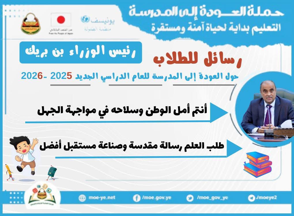 وجّه دولة رئيس الوزراء، الدكتور سالم بن بريك، رسائل مهمة للمعلمين والطلاب في مختلف المحافظات، بمناسبة تدشين العام الدراسي الجديد 2025 – 2026. وأكد رئيس الوزراء في رسالته إلى المعلمين أن مطالبهم مشروعة وتقع ضمن أولويات الحكومة، غير أن التوقف عن التعليم من شأنه أن يضاعف معاناة المجتمع ويهدد مستقبل الأجيال، داعياً المعلمين إلى الموازنة بين حقوقهم وواجباتهم الوطنية في هذه المرحلة الحرجة. وفي رسالته للطلاب، شدد الدكتور سالم بن بريك على أنهم يمثلون أمل المستقبل وسلاحه في مواجهة الجهل، مؤكداً أن طلب العلم يعد رسالة مقدسة ومساراً أساسياً لبناء وطن مزدهر وصناعة مستقبل أفضل. وأشار رئيس الوزراء إلى أن الحكومة تولي قطاع التعليم اهتماماً متزايداً، باعتباره الركيزة الأساسية للتنمية وبناء