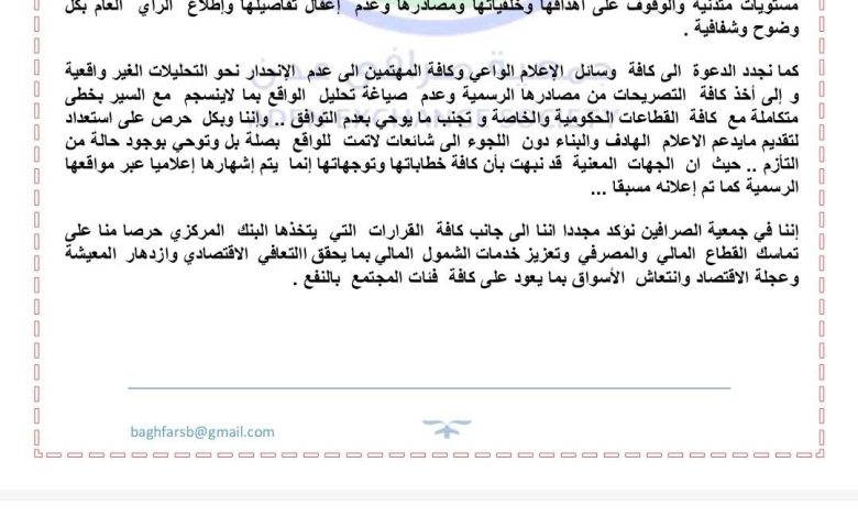 واختتمت الجمعية بيانها بدعوة جميع الأطراف إلى تحمل مسؤولياتهم في هذه المرحلة الحساسة، والعمل بشكل جماعي للحفاظ على استقرار الاقتصاد والعملة الوطنية.