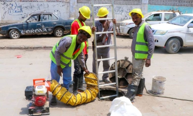 فرق صيانة مؤسسة المياه تنفذ حملة شاملة لتصفية شبكات الصرف الصحي في مديريات عدن