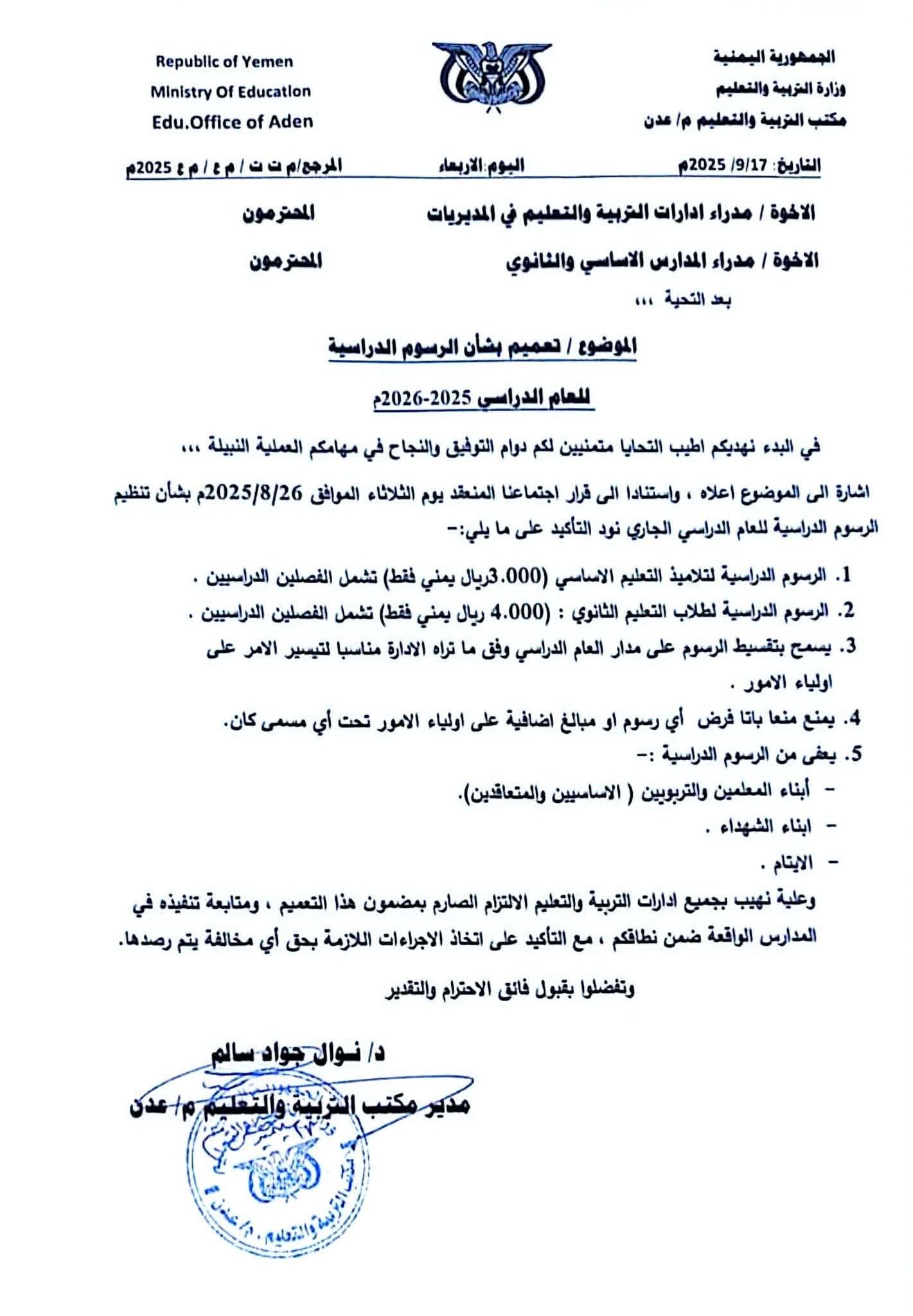 عدن اوبزيرفر:مكتب التربيه والتعليم عدن يحدد الرسوم الدراسيه مدارس الحكوميه تعميم بشأن الرسوم الدراسية
