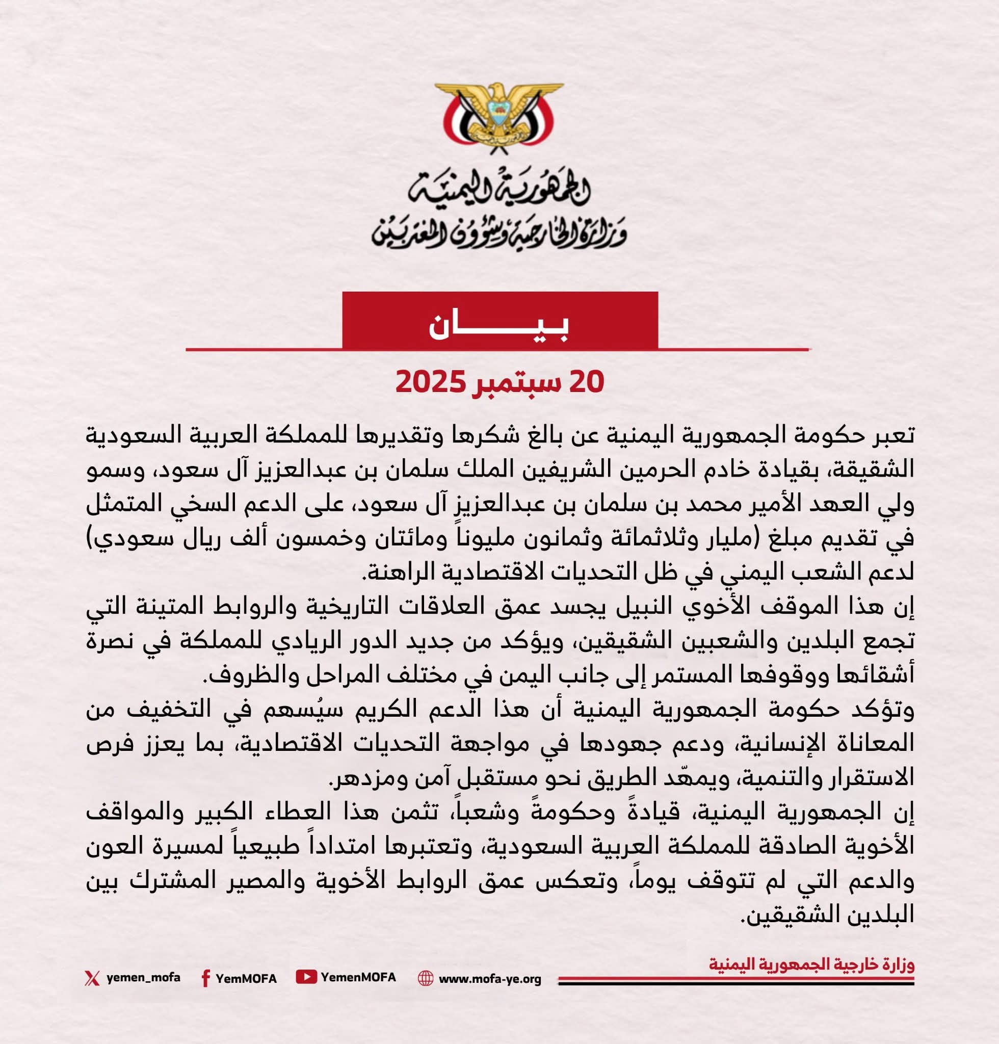 اعربت حكومة الجمهورية اليمنية عن بالغ شكرها وتقديرها للمملكة العربية السعودية الشقيقة، بقيادة خادم الحرمين الشريفين الملك سلمان بن عبدالعزيز آل سعود، وسمو ولي العهد الأمير محمد بن سلمان بن عبدالعزيز آل سعود، على الدعم السخي المتمثل في تقديم مبلغ (مليار وثلاثمائة وثمانون مليوناً ومائتان وخمسون ألف ريال سعودي) لدعم الشعب اليمني في ظل التحديات الاقتصادية الراهنة.