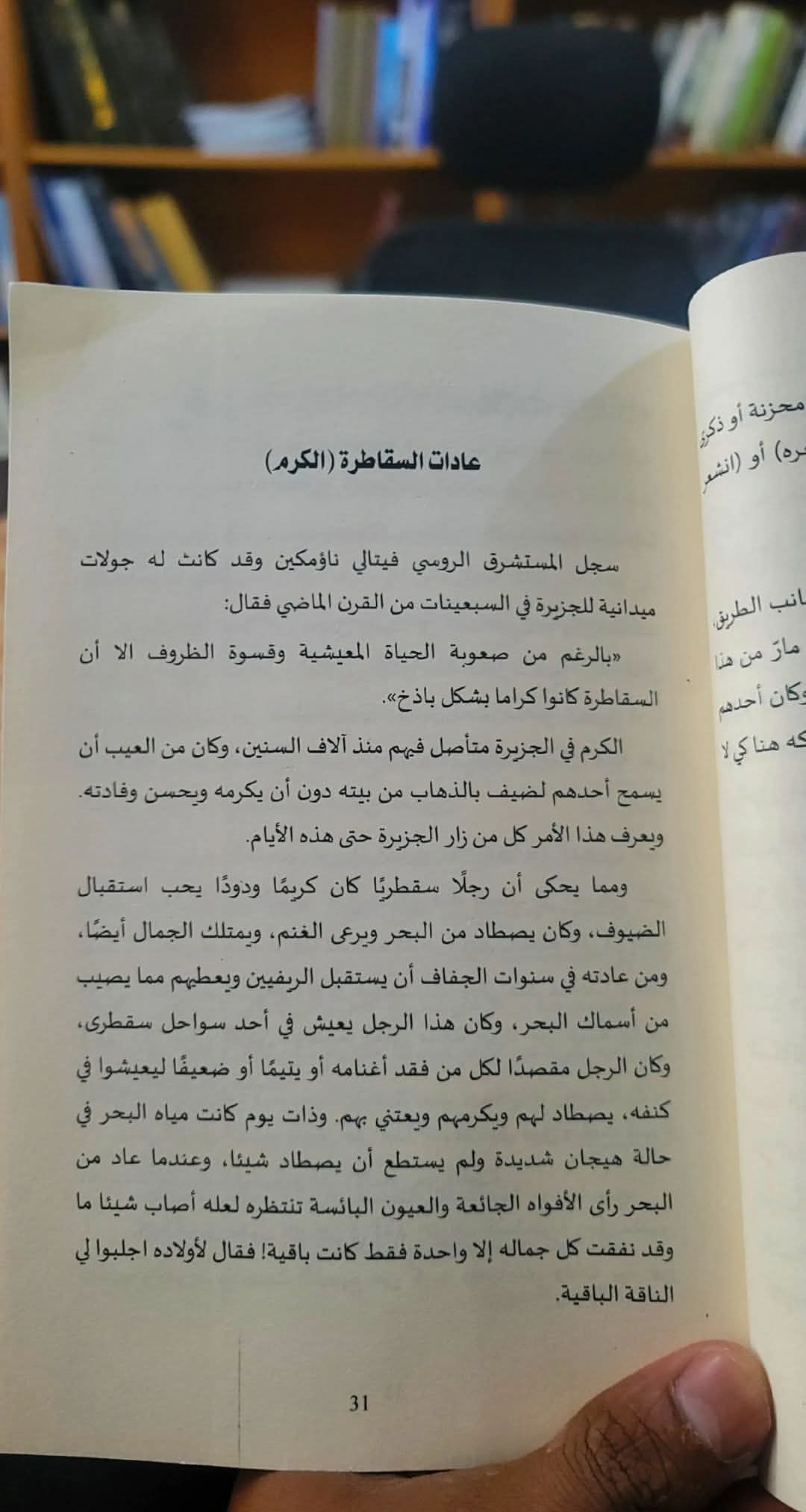 صراحتاً الكتاب ممتع وقيّم للباحثين عن عادات سقطرى وتقاليدها، فرصة للتعرّف على سقطرى ليس فقط كجزيرة طبيعية فريدة، بل كمجتمع له عادات وتقاليد عريقة تستحق الاهتمام والدراسة، وكذلك لفت انتباهي حرص المؤلف على التوثيق الميداني المباشر، مما يضيف للكتاب مصداقية عالية وقيمة بحثية متميزة.